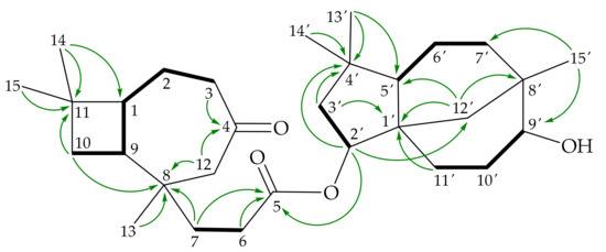 From the 1H–1H COSY spectrum, the data differentiated the spin systems H2-10/H-9/H-1/H2-2/H2-3, H2-6/H2-7, H-2’/H2-3´, H-5´/H2-6´/H2-7´, and H-9´/H2-10´/H2-11´ (Figure 5), and these findings together with the results of key HMBC correlations shown in Figure 5 confirmed the carbon skeleton of 4. An HMBC correlation between H-2´ (δH 4.83), an oxymethine proton, and the C-5 ester carbonyl carbon (δC 173.6) was found, which proved the existence of an ester linkage in 4. It was found that the NMR data were similar to those of 1 and 3, and this compound was proven to be the dehydrated product of 1 and 3. Due to the absolute configurations of 1 and 3 having been determined, the absolute configurations of the stereogenic carbons of 4 were assigned as (1R,8S,9S,1´S,2´S,5´S,8´R,9´R) (Supplementary Materials, Figures S17–S23).
