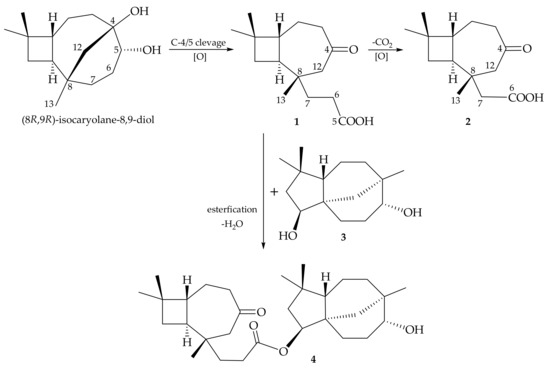 - Racero, J.C.; Macías-Sánchez, A.J.; Hernández-Galán, R.; Hitchcock, P.B.; Hanson, J.R.; Collado, I.G. Novel Rearrangement of an Isocaryolane Sesquiterpenoid under Mitsunobu Conditions. J. Org. Chem. 2000, 65, 7786–7791. [Google Scholar] [CrossRef]