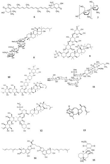 Sea cucumbers are echinoderms belonging to the Holothuriidae. These organisms have been used as functional food [] and a source of bioactive compounds []. The extract, containing lanostane-type triterpene oligoglycosides echinoside A (8) (EA) and holothurin A (9) (HA), was isolated from sea cucumber Pearsonothuria graeffei. Among others, EA and HA show promising anticancer activity [,]. The pharmacokinetic was characterized after single i/v (0.2 mg/kg) and peroral (30 mg/kg) administration of extract to rats. Both saponins were rapidly absorbed and appeared in serum at 4.0 (EA) and 0.94 μg/mL (HA) in the first minute after i/v injection. The serum concentration–time functions for EA and HA are characterized with two maxima after peroral administration. The concentrations of EA and HA at 0.5 h reached 0.11 and 0.2 µg/mL, respectively. The first Cmax was 0.83 µg/mL (EA) and 0.34 µg/mL (HA) at a Tmax of 3 h and the second Cmax were 0.24 µg/mL (Tmax = 7 h) for EA and 0.27 µg/mL (Tmax = 9 h) for HA [].