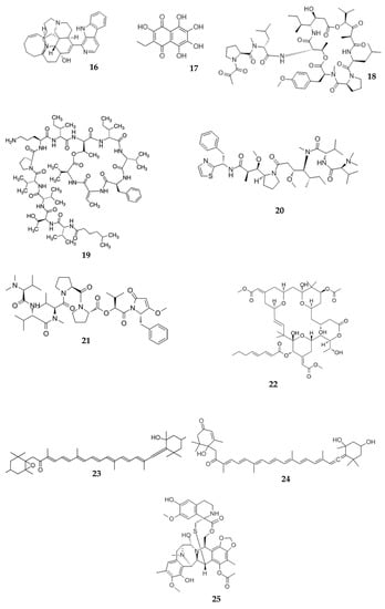 β-carboline alkaloid manzamine A (16), isolated from a sponge of Haliclona sp., exhibited potent antibacterial, anti-cancer, anti-malarial, and anti-HIV activities [,,,]. In a pharmacokinetics study, manzamine A isolated from a sponge of the Acanthostrongylophora genus was administered to rats by i/v (10 mg/kg) and peroral (50 mg/kg) routes. After i/v injection, the plasma concentration of manzamine A was about 40 μg/mL. The plasma concentration–time function was exponential. After peroral administration, manzamine gradually increased in plasma and reached Cmax of 1066 ng/mL at a Tmax of 10 h. Manzamine A has good solubility in acids. This is helpful for its absorption in the stomach. The logP (8.34) determined during chromatographic method development suggests a reasonable permeability for this alkaloid [].