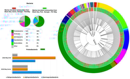 Gonio waters showed a different microbial composition. Notably, in May, prokaryotic communities, according to the GOTTCHA database, were mainly represented by Proteobacteria (51%) and Firmicutes (18%), while Actinobacteria (48%) and Proteobacteria (28%) prevailed in September (Figure 1). Unlike Poti waters, Cyanobacteria were less prevalent in Gonio, comprising on average only 5% of total metagenomic reads. At the class level in May, the Gonio sample was dominated by Gammaproteobacteria (23%), followed by Bacilli (14%), Alphaproteobacteria (12%), Betaproteobacteria (12%), Mollicutes (7%), Actinobacteria (4%), and Clostridia (4%), while in September, abundance of Actinobacteria increased significantly, comprising 47% of the total microbial community, followed by Alphaproteobacteria (11%), Gammaproteobacteria (9%), Cyanobacteria (7%), and Betaproteobacteria (4%). Prokaryotic taxonomic diversity level showed temporal variation at the genus level as well. In May, the dominant bacterial genera were represented by Acinetobacter, Alteromonas, Sphingobium, Methylobacterium, Synechococcus, Shewanella, Candidatus Pelagibacter, Vibrio, Pseudomonas, Thalassolituus, and Maricaulis, while in September, Mycobacterium, Methylobacterium, Synechococcus, Sphingopyxis, alpha proteobacterium HIMB59, Zymomonas, Rhodococcus, Francisella, and Rhodopseudomonas prevailed (Figure 2).