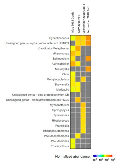 Normalized abundances of microorganisms at the genus level in Poti and Gonio water samples in May and September 2018.