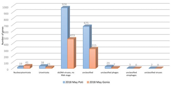 Taxonomic analysis was performed using the EDGE Bioinformatics online tool (version EDGE-UI v2.4.0) []. For assigning taxonomic labels to metagenomic prokaryotic and viral DNA sequences, Kraken [], Genomic Origins Through Taxonomic CHAllenge (GOTTCHA) (bacterial species database), and GOTTCHA 2 (viral species database) were used. Metagenomic datasets are available in the National Center for Biotechnology Information (NCBI) under accession numbers SAMN16453361 (Gonio P-24), SAMN16453362 (Gonio BS29), SAMN16453363 (Poti P-21), SAMN16453364 (Poti BS26), SAMN16453365 (Gonio P34), SAMN16453366 (Poti P31), and SAMN16453367 (Poti BS36).