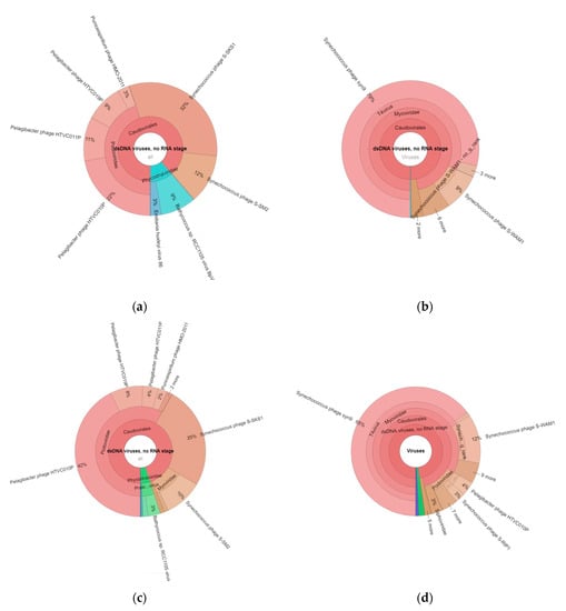 Taxonomic composition of viruses in the Black Sea viral metagenomes obtained by alignment of sequence reads to GOTTCHA 2 viral database. (a) Gonio May 2018; (b) Gonio September 2018; (c) Poti May 2018; (d) Poti September 2018.