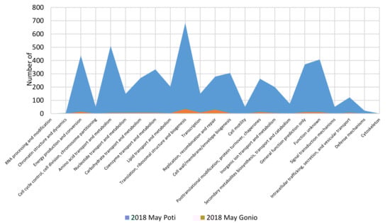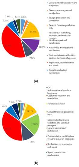 Distribution of viral community genes among functional categories of Pfam pathway. (a) Poti May; (b) Gonio May.