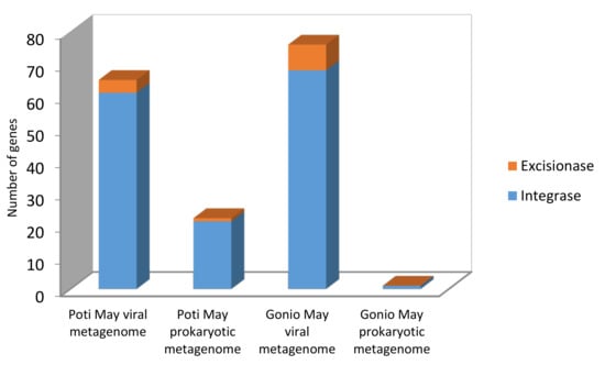 Besides performing identification of prophage-like sequences, we also studied the presence of integrase and excisionase genes in the prokaryotic contigs. It should be noted that establishment of lysogeny requires bacteriophage expression of integrase, while excision requires an additional phage-encoded protein called excisionase. Therefore, these two proteins are considered markers of lysogenic infection [].