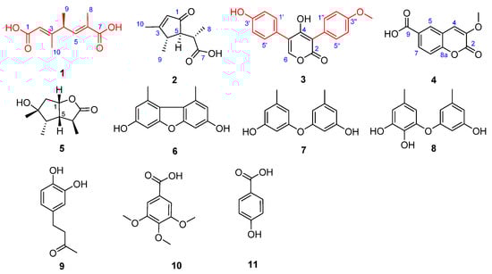 In addition, seven known compounds were established to be pestalotiolactone A (5) [42,43], 3,7-dihydroxy-1,9-dimethyldibenzofuran (6) [44], diorcinol (7) [45], cordyol C (8) [46], 4-(3′,4′-dihydroxyphenyl)-2-butanone (9) [47], 3,4,5-trimethoxybenzoic acid (10) [48], and 4-hydroxybenzoic acid (11) [49] on the basis of comparison of their NMR and specific rotation data with those reported in the literature.