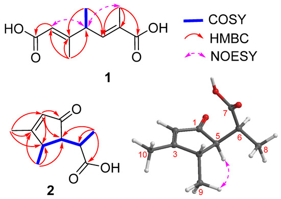 Key COSY, HMBC, and NOESY correlations of 1 and 2.