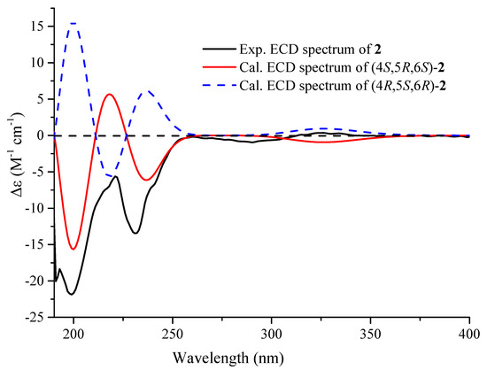 The eight conformers of (4S*,5R*,6S*)-2 were optimized by density functional theory (DFT) calculations at the B3LYP/6-31+G(d,p) level in gas phase using Gaussian 09. The energies, oscillator strengths, and rotational strengths of the first 60 electronic excitations were calculated by the TDDFT method at the B3LYP/6-311+G(2d,p) level in methanol. The ECD spectrum was simulated using SpecDis (version1.70, Berlin, Germany) by applying the Gaussian band shapes with sigma = 0.3 eV. Finally, the calculated ECD data were weighted and then summed up each stable conformer on the basis of the Boltzmann population.