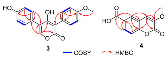 Selected COSY and HMBC correlations of compounds 3 and 4.
