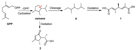 Compound 1 was a novel chained monoterpenoid. The plausible biosynthetic pathway for 1 and 2 was proposed (Scheme 1). Starting from the GPP, hydrosis, oxygenation, and cyclization reaction occurrence constructed the monocyclic ring monoterpenoid osmane. The osmane might undergo carbon–carbon bond cleavage to form a key intermediate A, which was further oxygenated to yield 1. Additionally, the osmane might also undergo oxygenation to form 2.