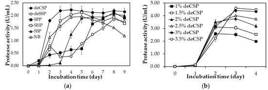 In this study, several common types of SPBP were chosen for the investigation, including SHP, SPP, SSP, deSSP, and deCSP. One percent (w/v) of each type of SPBP was added to a basic mineral medium with MgSO4 (0.05%, w/v) and K2HPO4 (0.1%, w/v) to provide carbon and nitrogen nutrients for the action of Paenibacillus sp. TKU052. As shown in Figure 1a, the maximal protease activity of each medium was 2.23 ± 0.22 U/mL (deCSP, day 4), 1.86 ± 0.08 U/mL (deSSP, day 8), 2.12 ± 0.10 U/mL (SPP, day 8), 2.12 ± 0.13 U/mL (SHP, day 5), 2.06 ± 0.12 U/mL (SSP, day 8), and 1.96 ± 0.03 U/mL (NB, day 4). Moreover, the protease activity on days 2 and 3 of the deCSP-containing medium did not show any significant difference (2.19 ± 0.17 U/mL and 2.23 ± 0.22 U/mL, respectively). Thus, the deCSP-containing medium was found to be the most suitable for the protease synthesis by Paenibacillus sp. TKU052 base on the highest maximum enzyme activity with a shorter incubation time.
