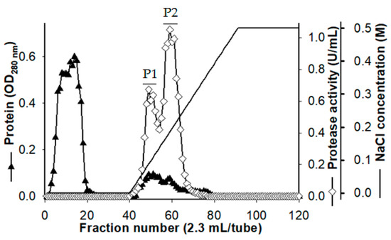 Two hundred and fifty milliliters of 3-day culture supernatant was used to purify the produced proteases under the following condition: Macro-Prep High S resin, 20 mM potassium phosphate (pH 6.0), and NaCl gradient from 0 M to 0.5 M. Two fractions with protease activity, named P1 and P2, were observed at the elution stage of the ion-exchange chromatography (Figure 2). Prior to the application of the next purification step, the P1 and P2 fractions were pooled, dialyzed against the buffer, and lyophilized. A high-performance liquid chromatography device with a KW-802 column was used for purification following the gel filtration method. Finally, the recovery yield of P1 and P2 fractions was 5.80% and 26.50% with 15.84 U/mg and 49.44 U/mg, respectively, of their specific activity (Table 1).