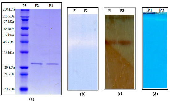 The obtained proteases were examined for their homogeneity using SDS-PAGE and Coomassie blue staining. According to Figure 3a, both P1 and P2 showed a single band of 31 kDa (approximately). The obtained proteases also exhibited their in-gel proteolytic activity by zymogram analysis using gelatin as the substrate. One proteolytic band was observed at the same location in the lanes of both P1 and P2, on the gel (Figure 3b), indicating that two proteases have the same MW. Later on, the zymogram gel was silver-stained to re-confirm the homogeneity of the obtained proteases and only one protein band was observed at the location of the proteolytic band (Figure 3c). This indicates that the protease purification process was successful. Paenibacillus strains are often reported to secrete only one protease into the culture medium, however, some strains such as P. polymyxa SCE2 and P. peoriae NRRL BD-62 could produce four different proteases on thiamine, biotin, and nitrogen broth [9,10,14,37,38,39,40,41]. Notably, here, two proteases with the same MW (31 kDa) were isolated and purified from the culture supernatant of Paenibacillus sp. TKU052. Furthermore, the native-PAGE analysis revealed that P1 and P2 have different migration rates (Figure 3d). This result indicates that purified P1 and P2 are different isoenzymes. To the best of our knowledge, this could be the first report of protease isoenzymes from Paenibacillus strains. As such, the results of this study could be a valuable contribution to the existing knowledge about proteases from the genus Paenibacillus.