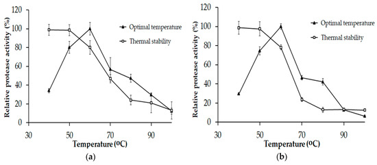 Optimal temperature and thermal stability of P1 (a) and P2 (b). The error bar is the standard deviation of three replications.