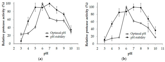 The influence of pH on the enzyme activity and stability of P1 and P2 was evaluated in the range of pH 3–10. Both P1 and P2 exhibited the highest activity at pH 6 and maintained over 80% of their activity in the range of pH 5–8 (Figure 5). This result differs from that reported in earlier studies, in which proteases from Paenibacillus strains exhibited optimal pH under alkaline conditions [9,10,14,37,38,39,40,41].