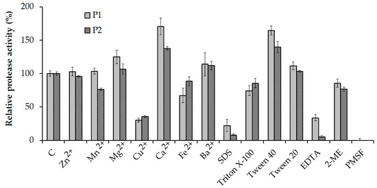 Effect of various chemicals on the activity of P1 and P2. The error bar is the standard deviation of three replications. EDTA, ethylenediaminetetraacetic acid; 2-ME, 2-mercaptoethanol; PMSF, phenylmethylsulfonyl fluoride.