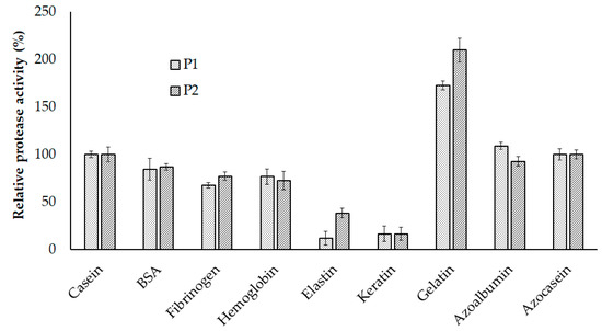 The activity of the enzymes with casein as the control (100%) was used to examine enzyme specificity over other substrates, including bovine serum albumin (BSA), fibrinogen, hemoglobin, elastin, gelatin, and keratin. The result is displayed in Figure 7. Among these, P1 and P2 displayed the highest activity towards gelatin (172.58 ± 4.71% and 209.85 ± 12.43%, respectively) and the lowest towards elastin (12.32 ± 7.20% and 38.4 ± 5.04%, respectively), and keratin (16.49 ± 8.03% and 16.49 ± 6.82%, respectively). The activities of P1 and P2 on substrates including BSA (84.44 ± 11.41% and 87.00 ± 3.68%, respectively), fibrinogen (67.55 ± 3.08% and 77.08 ± 4.30%, respectively), and hemoglobin (76.82 ± 8.23% and 72.47 ± 8.23%, respectively) did not show any significant difference. Besides, no significant difference in the protease activity of P1 and P2 was observed towards azoalbumin (109.11 ± 3.90% and 92.72 ± 4.87%, respectively), and azocasein (100.00 ± 5.76% and 100.00 ± 4.46%, respectively).