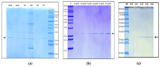 SDS-PAGE fingerprints of culture supernatants obtained from media containing different concentrations of SPBPs (a), deCSP (b), and from 3% deCSP with different incubation times (c): the position of protease bands.