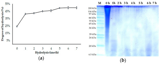 The enzyme solution used in this experiment was a mixture of P1 and P2 fractions obtained from the ion-exchange chromatography step. Gelatin was prepared at a concentration of 1% (w/v) in PPB (pH 6) and the hydrolysis was performed for 0–7 h at 60 °C. At the end of hydrolysis, the reaction solution was heated at 100 °C for 30 min to eliminate any enzyme activity. The gelatin hydrolysate was then dried by the freezing-drying method. The DH of gelatin hydrolysate was detected based on the quantification of the soluble protein [50]. The SDS-PAGE analysis of gelatin hydrolysate was according to the SDS-PAGE protocol described above.