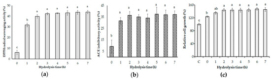 Evaluation of the 2,2-diphenyl-1-picrylhydrazyl (DPPH) radical scavenging activity (a), angiotensin-I converting enzyme (ACE) inhibitory activity (b), and the growth-enhancing effect on B. bifidum BCRC 14615 (c) of gelatin hydrolysates. The error bar is the standard deviation of three replications. The letters a, b, and c indicate significant differences based on Tukey’s HSD (honestly significant difference) test with p < 0.05.