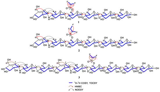 Careful comparison of NMR data of 1 with those of previously reported from Streptomyces sp. HO1518 [24], 1 was inferred as an aminooligosaccharide derivative, which was characterized by acarviosin moiety with d-glucose units attached in the reducing terminus through the glycosidic bond. The reducing terminal glucose unit (ring A) was confirmed by the typical protons of H-A1α, H-A1β and H-A2β (δH 5.24, 4.66 and 3.28), while the chemical shift of three low-field protons (δH 5.42, 3H, overlapped) allowed for the assignment of the anomeric protons of rings B–D [27]. Analysis of its 2D TOCSY spectrum (Figure S15) revealed the presence of two spin systems as depicted with bold blue lines in Figure 2: H-E1/H-E4/H3-E6 and H-F1/H-F4/H2-F6/H-F7, which clearly revealed the presence of one acarviosin substructure (rings E and F) evidenced by the HMBC correlations from H-E4 (δH 2.46) to C-F1 (δH 56.0) and C-F2 (δH 72.9) as well as H-F1 (δH 3.53) to C-E4 (δH 65.0). When the independent protonic signals (δH 5.24, 4.66, 5.42, 4.44, 5.27, and 5.90) were selectively irradiated by the 1D-selective TOCSY experiments (Figures S2–S7), six self-spin systems of residues A-F were successfully acquired and their corresponding 13C NMR data could be confirmed on the basis of a comprehensive inspection of HSQC, HMBC, and HSQC-TOCSY spectra (Figures S10, S13 and S14). The remaining carbons resonated at δC 180.1, 33.8, 18.1, and 18.2 in 1 and were ascribed as an isobutyryl fragment, which was supported by the HMBC correlations from H3-3′ and H3-4′ to C-1′ and C-2′. The linkage of the isobutyryl group to the ring D was at C-D6 via an oxygen attributable to the down-field shifted methylene proton H2-D6 (δH 4.44, 4.23), as determined by the pivotal HMBC interaction from H-D6a to C-1′ (δC 180.1), indicating that the C-D6 hydroxyl group of 1 was esterified with the isobutyric acid.