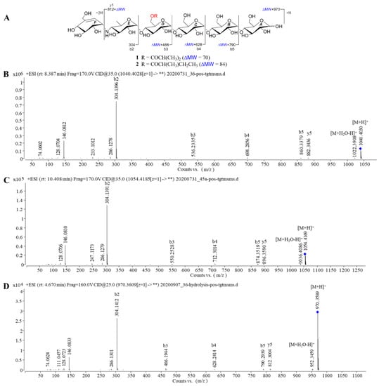 Compound 2 was obtained as white amorphous powder with the molecular formula C42H71NO29, as determined by its HRESIMS data. The 1H and 13C NMR spectral data (Table 1) of 2 were almost in accordance with those of 1, except for the possible replacement of the isobutyryl functionality in 1 by an additional 2-methyl-butyryl group [δC 179.8 (C-1′), δH 2.52 (H-2′), δC 40.9 (C-2′), δH 1.64, 1.51 (H2-3′), δC 26.4 (C-3′), δH 0.88 (H3-4′), δC 10.8 (C-4′), δH 1.14 (H3-5′), δC 15.7 (C-5′)] in 2, which could be verified by the 1H-1H COSY cross peak of H3-5′/H-2′/H2-3′/H3-4′ as well as the HMBC correlations from H-2′, H2-3′ and H3-5′ to C-1′ and H3-4′ to C-2′ (Figure 2). Similarly, four proton signals in the residue D (δH 3.93, 3.63, 4.01, 4.20 and 4.44) of 2 were slightly low-field shifted by comparing with 9, which suggested that the -OH at C-D6 was esterified with the five-carbon acyl group in 2. Further support for the proposed assignment was evidenced by the HMBC correlation of H-D6a (δH 4.44) to C-1′ (δC 179.8) and the ESIMS/MS peaks at m/z 896 (y5), 874 (b5), 712 (b4), 550 (b3), and 304 (b2). The configuration of the glycosidic bonds in 2 was deduced to be the same as that of 1 based on the similar 1H-1H coupling constants of the anomeric protons between 1 and 2, which could be reconfirmed by the NOESY spectrum (Figure S33). Meanwhile, the alkaline hydrolysis method was applied to determine the absolute configuration of 2-methyl-butyryl side chain in 2 [29]. Unfortunately, substantial tentative efforts to acquire its related esterification products were failed mainly attributable to the limit amount of 2. Therefore, the absolute configuration of the acyl unit remains undetermined.