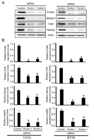 Because AST reduced the expression levels of pontin, mutp53, Nanog, and Oct4, their levels were analyzed by Western blotting and quantitative reverse transcriptase polymerase chain reaction (qRT-PCR) analyses following pontin knockdown in T47D and BT20 cells. As shown in Figure 3A, after transfection of pontin siRNAs, the protein expression levels of mutp53, Nanog, and Oct4 were downregulated compared to control.