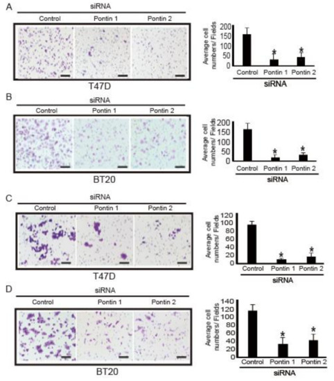 Transwell chambers were used to examine cell invasion capability. T47D and BT20 cells were transfected with pontin-targeting or control siRNA oligos for 48 h. For transwell assays, the transwell chambers were coated with 100 µL BD Biosciences Matrigel™ overnight in a cell incubator. Then, transfected cells were trypsinized and resuspended at 1 × 105 cells in 200 µL serum-free medium. The resuspended cells were placed into the upper chambers of a 24-well transwell plate (8 mm pore size; Corning Inc., Corning, NY, USA). The lower chambers were filled with 700 µL complete medium with 10% FBS. Following incubation for 24 h at 37 °C, non-invading cells were removed from the upper chamber with a cotton swab. Invading cells on the lower surface of the inserts were fixed with 4% paraformaldehyde and stained with 1% crystal violet. Three random fields for each insert were counted at 200× magnification. Data were recorded as the mean ± SD of at least three independent experiments.