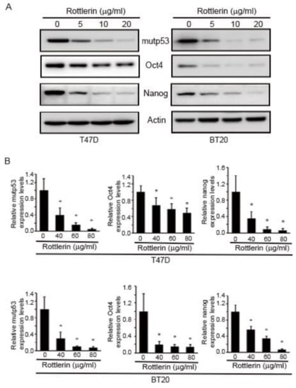 2.6. Rottlerin Reduces Expression Levels of Oct4, Nanog, and mutp53 in T47D and BT20 Breast Cancer Cells