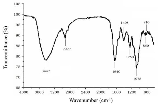 The FTIR of LJPS is shown in Figure 1. The strong absorbance peak at 3447 cm−1 obviously represents a typical major broad stretching peak of O-H, and the narrow weak peak at 2927 cm−1 was assigned to C-H bonds, which is consistent with previous reports [19,39]. Absorption around 1640 cm−1 and 1078 cm−1 revealed C=O and C-O bonds in the carbohydrate, respectively, which further indicates the presence of a sugar ring structure. In addition, the characteristic peak at 1250 cm−1 was caused by an S=O stretching vibration. Absorbance peaks around 810 cm−1 and 850 cm−1 were associated with a C-O-S stretching vibration. The peak around 850 cm−1 suggested sulfate groups located at the axial C4 position [39]. The FTIR results further indicate that LJPS is a sulfated polysaccharide.