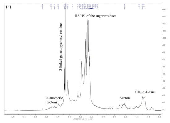 NMR spectroscopy is a common and powerful tool for the structural characterization of sulfated polysaccharides from seaweed [40]. Like many other fucoidan fractions, LJPS has a quite complicated NMR spectrum. The complexity of the sulfated polysaccharide structure causes most of the ring proton signals at various locations to be concentrated in the narrow range of 3.0–5.0 ppm, and the stacking is serious. Nevertheless, the 1H-NMR spectrum can still be analyzed to some extent. The 1H-NMR spectrum of LJPS is shown in Figure 2a. The signals at 1.19 ppm represent methyl protons of α-L-fucf-(1→3) residues [19]. The peak at 1.25 and 1.40 ppm was associated with the C6 methyl proton group of L-fucopyranose [19,31,41]. The minor signal region of broadened peaks from 5.0 to 5.7 ppm was associated with anomeric protons of α-L-fucopyranosyl residues [19,41]. The ring protons H2-H5 of the sugar residues were confirmed by the intense unresolved peaks at 3.58–4.71 ppm [19,31]. The intense anomeric signal at 4.57 ppm was associated with H1 of β-galactopyranosyl residues [41]. The signal at 4.69 ppm was assigned to 3-linked D-galactopyranosyl residues [31].