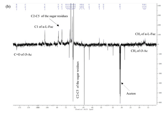 In addition, the structure of LJPS was further analyzed by the 13C-DEPTQ spectrum (Figure 2b). The 13C-DEPTQ spectrum yields signal and multiplicity information for all carbon types with marked increasing signals of sensitivity-limiting quaternary carbons. In the 13C-DEPTQ spectrum of LJPS, several intense signals in the anomeric (100.9–102.6) and high-field (16.7–17.6) regions that are typical of α-L-fucopyranose residues were detected [19]. Vishchuk et al. [38] and Ni et al. [19] ascribed signals at 16.7–17.6 ppm and 100.9–102.6 ppm to C6 and anomeric C1 carbons of α-L-fucopyranose, respectively. The intense signals at 101.3 ppm were attributed to C1 of 1,3-linked α-L-fucopyranose [19]. Intense signals in the 62–82 ppm region were associated with C2-C5 carbons of the pyranoid ring [41]. According to Wang et al. [42], the absence of visible signals around 83.0–86.0 ppm indicated an absence of C2-C4 linked galactose units, which suggested that galactose residues were C1 and C6 that are linked in LJPS. The resonance at 61.8 ppm and 66.1 ppm were assigned to non-6 linked (CH2OH) and O6 substituted (CH2OR) β-D-galactopyranose residues, respectively [38]. Relative weak carbonyl carbon signals at 171–177 ppm and corresponding methyl carbon signals at 20.5–21.9 ppm were associated with O-acetyl groups [38,41].