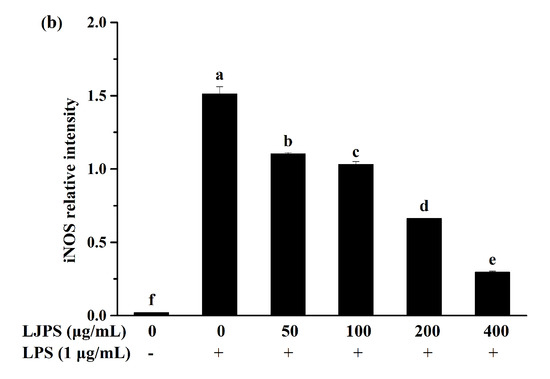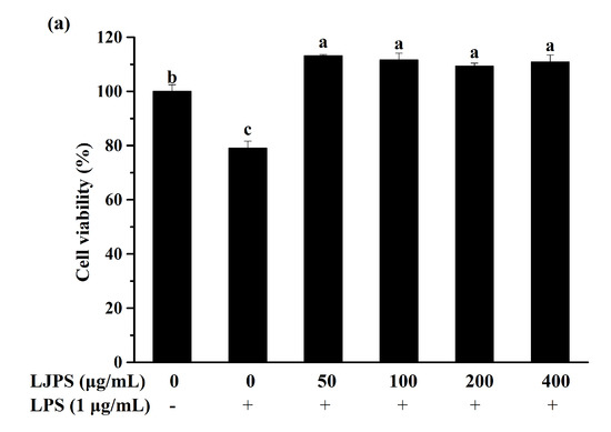 Before evaluating the anti-inflammatory effects of LJPS in vitro, a cytotoxicity assay was necessary for estimating the negative effects of LJPS on RAW 264.7 cells. As shown in Figure 3a, the viabilities of RAW 264.7 cells were more than 90% in all experimental groups and even higher than the control group, while the cell viability in the positive control group treated with LPS was decreased to 79.00% compared to those not treated with LPS. LJPS has no obvious cytotoxic effect on RAW 264.7 cells within the concentration range of 50–400 μg/mL. Four experimental groups showed no significant differences from each other via Tukey’s multiple-range test (p < 0.05).