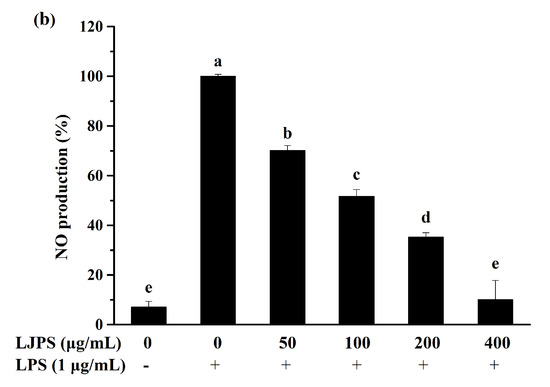 Effects of LJPS on cell viability and NO production in RAW 264.7 macrophages. (a) Cell viability; (b) NO production. Cell viability was measured by the MTT assay in order to evaluate the cytotoxicity of LJPS in RAW 264.7 cells, and cells treated with LPS were used as the positive control. The levels of NO in LPS-induced RAW 264.7 cells in the presence of LJPS or not were measured by Griess assay. All results are represented as the means ± SD of three independent experiments. Different superscript letters indicate significant differences from each other with p < 0.05 (Tukey’s multiple-range test).