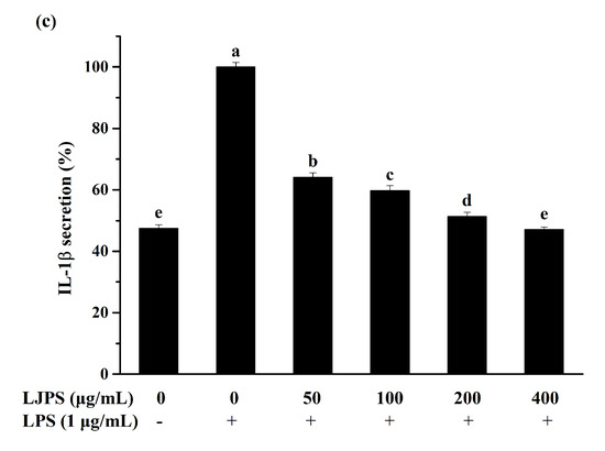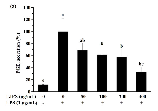 Effect of LJPS on PGE2 and pro-inflammatory cytokine secretion in lipopolysaccharide (LPS)-stimulated RAW 264.7 macrophages. (a) PGE2 secretion; (b) tumor necrosis factor (TNF)-α secretion; (c) IL-1β secretion. RAW 264.7 cells were pretreated with LJPS (50, 100, 200, and 400 μg/mL) first and then induced with LPS (1 μg/mL). After 24 h of incubation, culture media was collected for analysis of PGE2, TNF-α, and interleukin (IL)-1β. All results are represented as the means ± SD of three independent experiments. Different superscript letters indicate significant differences from each other with p < 0.05 (Tukey’s multiple-range test).