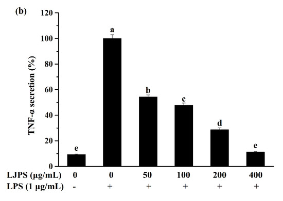 Cytokines, a kind of polypeptide regulator with a low molecular weight, are secreted by cells for an autocrine or paracrine effect. In inflammatory and immune systems, different cytokines can have similar or even identical functional activity. Additionally, they are known as pro-inflammatory cytokines, such as TNF-α and IL-1β [22]. TNF-α can induce acute inflammatory responses, activate the complement system to clear pathogens indirectly, and accelerate a proapoptotic profile in macrophages. IL-1β can also promote the apoptosis of abnormal cells and inflammatory responses mediated by pro-inflammatory mediators [24]. Moreover, the levels of pro-inflammatory cytokines have been accepted as indicators to evaluate the anti-inflammatory capacities in macrophages. Figure 4 indicates that the up-graduated secretion of IL-1β and TNF-α was progressively inhibited at increasing concentrations of LJPS. At an LJPS concentration of 400 μg/mL, TNF-α and IL-1β were effectively decreased to 11.28% and 47.04%, respectively, which indicated that LJPS had a much better anti-inflammatory capacity than the purified fraction (LJSF4); a depression of TNF-α to 55.47% and a depression of IL-1β to 43.30% at the highest concentration were shown [19].
