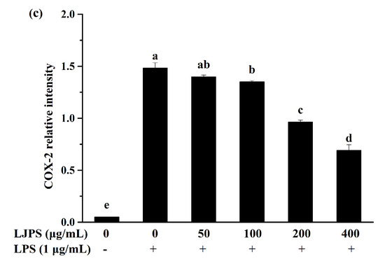 Effect of LJPS on iNOS and COX-2 protein expression in LPS-stimulated RAW 264.7 cells. (a) Expression analysis of iNOS and COX-2 evaluated using Western blot; (b) iNOS protein expression; (c) COX-2 protein expression. Western blot analysis was applied for evaluating iNOS and COX-2 expression at the protein level. The proteins’ levels were determined using Image J software. All results are represented as the means ± SD of three independent experiments. Different superscript letters indicate significant differences from each other with p < 0.05 (Tukey’s multiple-range test).