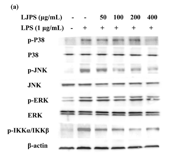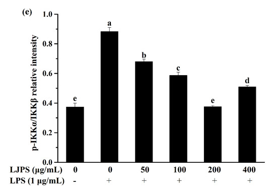 To investigate the activation of the NF-κB pathway and the effects of LJPS on it, related down-stream proteins in the cytosol were analyzed by the Western blot assay. As shown in Figure 6e, LPS stimulation led to activated phosphorylation levels of IKKα/β, which was dampened by pre-treatment with LJPS dose-dependently and significantly. After pre-incubation with different concentrations (50, 100, 200, and 400 μg/mL) of LJPS, compared with the LPS-treated group, the phosphorylation of IKKα/β was downregulated by 22.89%, 33.51%, 57.44%, and 42.31%, respectively. In general, LJPS showed an ability to inhibit the LPS-induced phosphorylation of p38 MARK, JNK, ERK, and IKKα/β in RAW 264.7 cells.