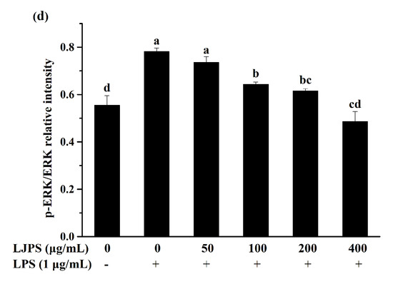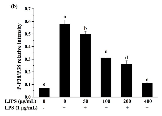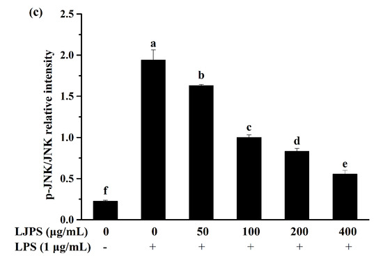 In the present study, the p38 mitogen-activated protein kinase (p38 MARK), c-Jun N-terminal kinase (JNK), and extracellular signal-regulated kinase (ERK) were analyzed to evaluate the activation of the MAPK signaling pathway. As Figure 6b–d shows, the phosphorylation of the MAPK pathway proteins in the presence of LPS were significantly promoted by about 8.1-, 8.6-, and 1.4-fold, respectively, compared with the control group (p < 0.05), while incubation with LJPS significantly inhibited the phosphorylation of MAPK proteins in a dose-dependent manner (p < 0.05). At the concentration of 400 μg/mL, p38 MARK, JNK, and ERK phosphorylation levels were respectively suppressed to 18.77%, 28.57%, and 62.15%, compared to the LPS-treated group. Dramatically, 400 μg/mL of LJPS downregulated the phosphorylation of ERK to 0.49 ± 0.04 (relative intensity of p-ERK/ERK), which was even lower than that of the control group, but with no significant difference (p < 0.05).