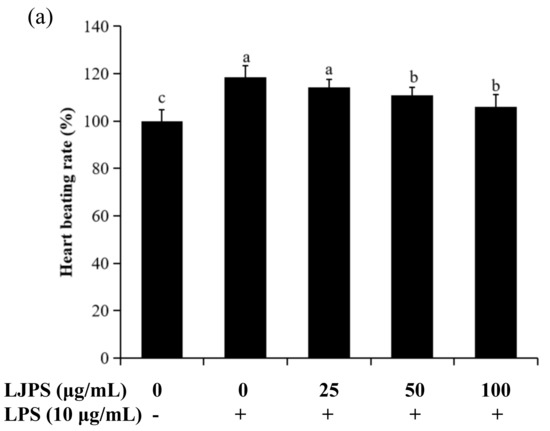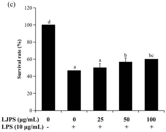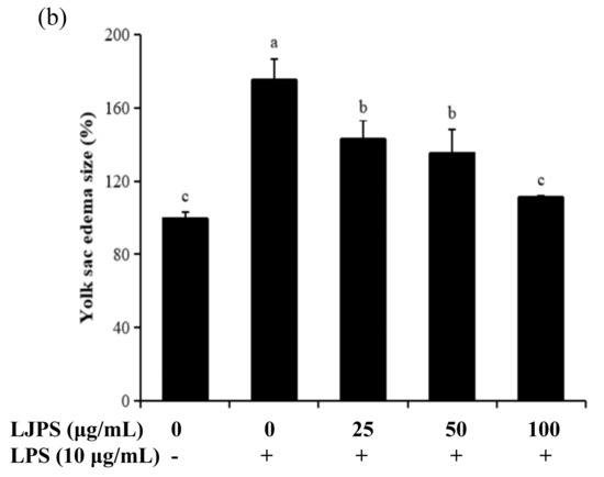 The heart rate, yolk sac edema size, and survival rate of LPS-stimulated zebrafish embryos after pretreatment with LJPS. (a) Heart rate; (b) yolk sac edema size; (c) survival rate. At 30 hpf after LPS (10 μg/mL) treatment, a microscope with a camera and embryos without active avoidance behaviors were used for the measurement of yolk sac edema size. At 2 dpf, heart rate was measured for 1 min in hatched embryos. The survival rate was determined at 3 dpf by counting the surviving hatched embryos. All results are represented as the means ± SD of three independent experiments. Different superscript letters indicate significant differences from each other with p < 0.05 (Tukey’s multiple-range test).