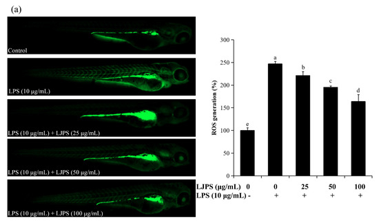 The fluorescence images and relative fluorescence intensity analysis of ROS and NO production are shown in Figure 8a,b. Enhanced fluorescence intensities were clearly observed in LPS-treated zebrafish larvae when compared to the control group.