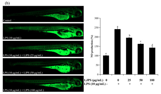 Accordingly, the relative fluorescence intensity analysis suggested that ROS and NO secretion in zebrafish larvae was promoted by treatment with LPS (10 μg/mL), but this decreased remarkably to 163.92% and 142.22%, respectively, in the presence of LJPS (100 μg/mL). In addition, LPS treatment significantly (p < 0.05) increased cell death to 238.74% when compared to the untreated group, as shown in Figure 8c. Similarly, after pre-treatment with LJPS, cell death stimulated by LPS was forcefully attenuated in a dose-dependent manner. The result was reduced remarkably to 176.24% at 100 μg/mL compared to the LPS-treated group. The results indicate that LJPS operatively inhibited LPS-induced cell death as well as NO and ROS generation in zebrafish embryos.