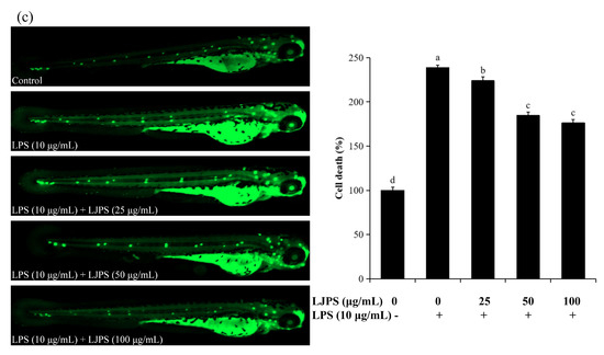 The protective effects of LJPS on cell death as well as ROS and NO production in LPS-stimulated zebrafish embryos. (a) ROS production; (b) NO production; (c) cell death. At 3 dpf after LPS (10 μg/mL) incubation, the levels of cell death and intracellular NO and ROS production were observed and photographed by a fluorescence microscope after staining with acridine orange, diamino fluorophore 4-amino-5-methylamino-2′7′-difluorofluorescein diacetate (DAF-FM DA), and 2, 7-dichlorodihydrofluorescein diacetate (DCFH-DA), respectively. All results are represented as the means ± SD of three independent experiments. Different superscript letters indicate significant differences from each other with p < 0.05 (Tukey’s multiple-range test).
