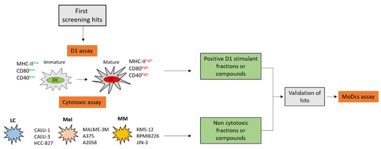 Overall scheme for hits selection. In the preliminary screening, natural products are tested on dendritic cell lines (D1) and for cytotoxicity on target lung carcinoma (LC), melanoma (Mel), and multiple myeloma (MM) cell lines. In the second step, the “candidate” samples are validated for immunomodulatory activity on human monocyte-derived dendritic cells (MoDCs).