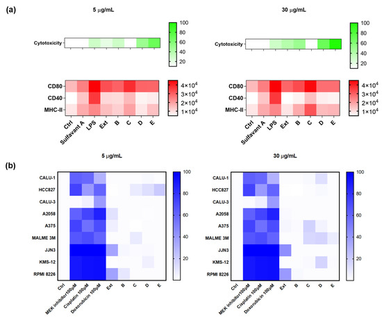 (a) Surface expression analysis of CD80, CD40, and MHC-II and percentage of vitality on D1 treated with the extract (Ext) and four fractions (B, C, D, E) that were derived from T. weissflogii at 5 and 30 µg/mL; all data were compared to the cells treated only with the vehicle (Ctrl) and cells treated with positive controls (LPS, Sulfavant A); (b) heat map of cytotoxicity assays conducted on the nine different cell lines. Cells were treated with positive controls, the extract (Ext) and four fractions (B, C, D, E) were derived from the marine diatom. Values reported in the color bar legend on the right indicate the % of cytotoxicity. The color bar on the right shows the MFI (mean fluorescence intensity) measured for each marker and the % of cytotoxicity.