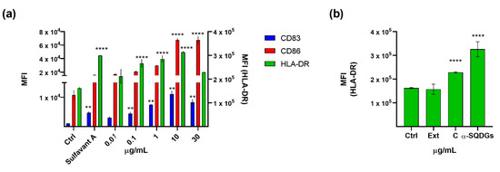 (a) Surface expression analysis of CD83, CD86, and HLA-DR in MoDCs treated with the fraction C derived from the extract of Thalassiosira weissflogii from 0.01 to 30 µg/mL; all data were compared to the cells treated only with the vehicle (Ctrl) and cells treated with Sulfavant A (30 µg/mL); (b) HLA-DR analysis of MoDCs treated with extract (Ext), SPE C fraction and purified α-SQDGs at concentration of 30 µg/mL; error bars indicate standard deviations; ** p < 0.01, **** p < 0.0001.