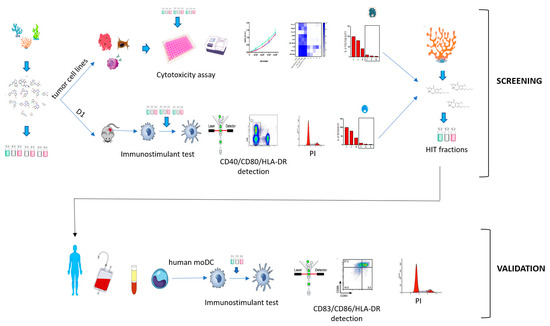 This result has prompted us to characterize other small molecules that are able to activate DCs and, potentially, enhance immune response against neoplastic cells. The aim of the present work is to describe how we can implement a screening platform to select natural products with potential application in cancer immunotherapy. In consideration of the role of the DC-T cell axis in the development of anti-cancer therapies, we propose an innovative approach based on the use of a growth factor-dependent immature mouse dendritic cell (D1) and a panel of tumor cell lines for the selection of primary fractions, followed by the validation on human monocyte-derived dendritic cells (MoDCs).