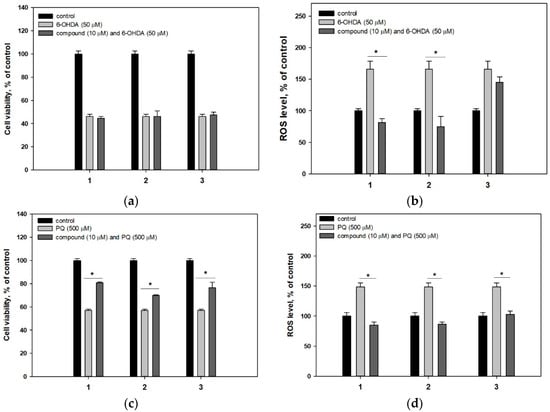 The neuroblastoma Neuro-2a line cells (1 × 104 cells/well) were treated with the test compounds at concentrations of 1 and/or 10 µM for 1 h, and then the neurotoxins were added to the neuroblastoma cell suspensions [17]. Rotenone (Sigma-Aldrich, USA) was used at the concentration of 10 µM. Paraquat (Sigma-Aldrich, USA) was used at 500 µM. 6-Hydroxydopamine (Sigma-Aldrich, USA) was used at 50 µM. Cells incubated without neurotoxins and the test compounds and cells incubated with neurotoxins only were used as positive and negative controls, respectively. After 24 h of incubation, the cell viabilities were measured using the MTT method. The results are presented as the percent of positive control data.