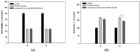 Influence of compounds 4 and 5 on viability of Neuro-2a cells treated with 6-OHDA (a), PQ (c) and rotenone (e). Influence of compounds 4 and 5 on the ROS level in cells treated with 6-OHDA (b), PQ (d) and rotenone (f). * Differences are significant with p ≤ 0.05. ** Differences are significant with p ≤ 0.10.